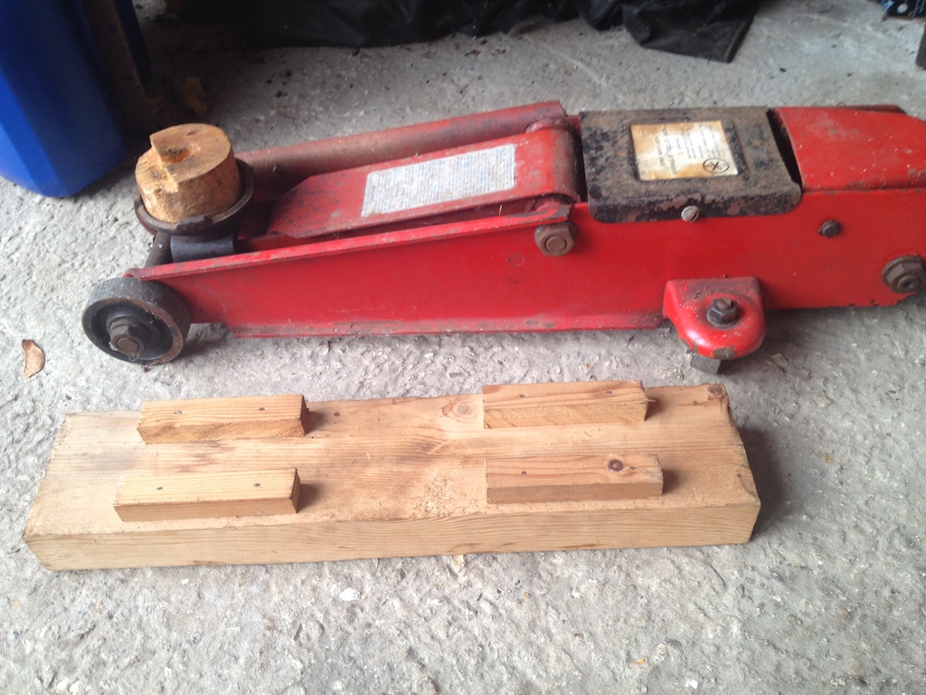 During my ownership of TC4985 I've always taken the view that I should avoid causing the chassis to twist. So unless I am just lifting a wheel enough to remove it I always raise the whole front or rear in one go, usually so as to put the car on axle stands. To do this I use a trolley jack under the front axle, with a length of 4"x2" wood to spread the load. In the photo you can see that I've fixed strips to the top so that it locates around the axle. At the rear I use another wooden block that locates over the drain plug on the rear axle. This block can be seen on the jack and is shaped underneath to fit into the cup.