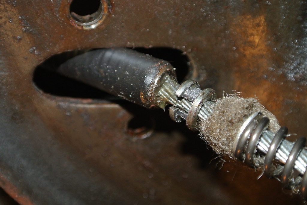The following photos show three points on one of the existing cables; within the drum (with the leading brake shoe removed); at the grease point (with the tube from the cable fitting to the grease nipple undone); the sheath fixing point on the chassis and the cable on the handbrake lever.