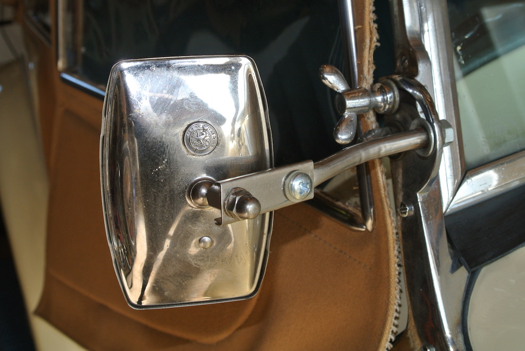 Neither the interior rear view mirror nor the window mirrors on TC4985 are 'standard issue'. These two small photos show examples of TC mirrors. The interior mirror is bolted to the scuttle top and the exterior mirrors are bolted to the windscreen supports. On TC4985, the interior mirror is attached to the windscreen by a rubber sucker, but provides a good rear view. The exterior mirrors are fixed to arms that are bolted into the windscreen lowering channel and the mirrors themselves are smaller than the originals.